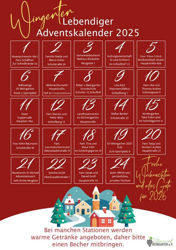 Liebe Wingerter,dieses Jahr findet er wieder statt, der Lebendige Adventskalender in Weingarten.Zum nunmehr dritten Mal gibt es in Weingarten 23 verschiedene Stationen, an man sich für ein paar besinnliche Momente in der Vorweihnachtszeit treffen kann. Das 24. Türchen darf jeder für sich selbst gestalten.Am Montag, den 01. Dezember öffnen wir das erste Türchen unseres Kalenders. […]